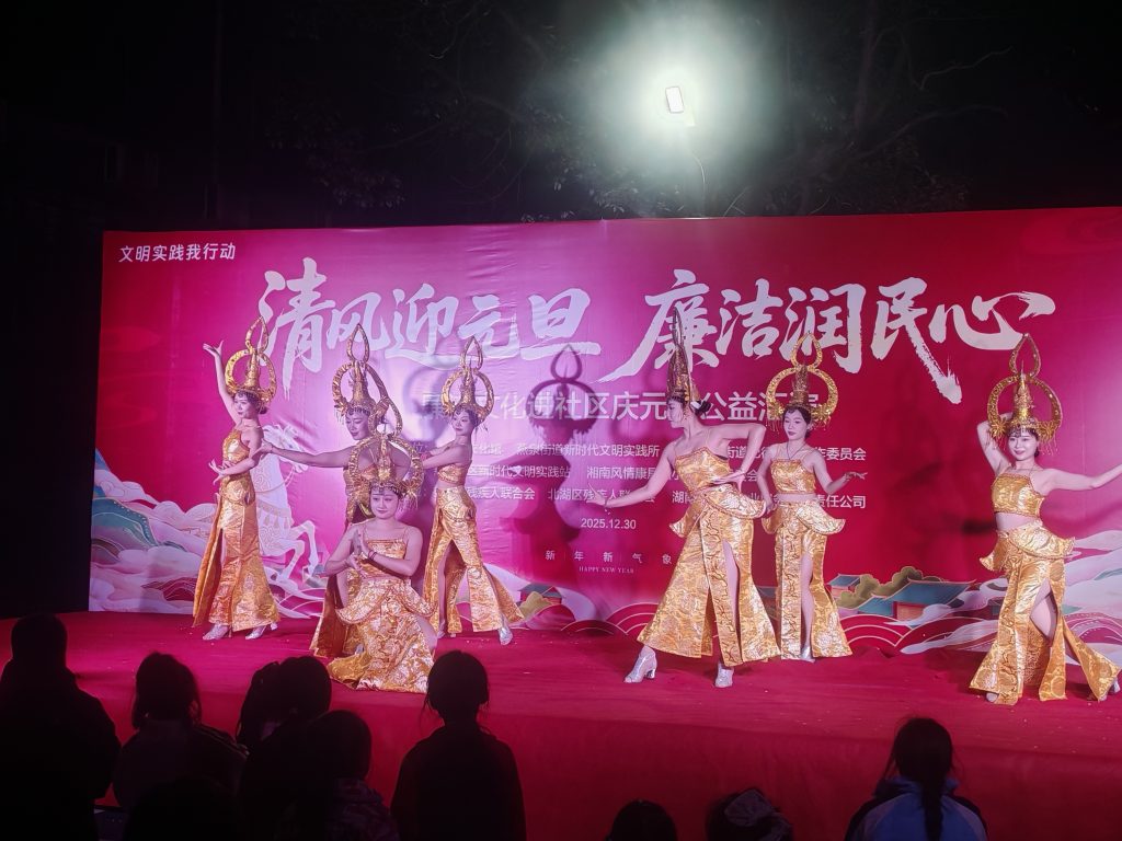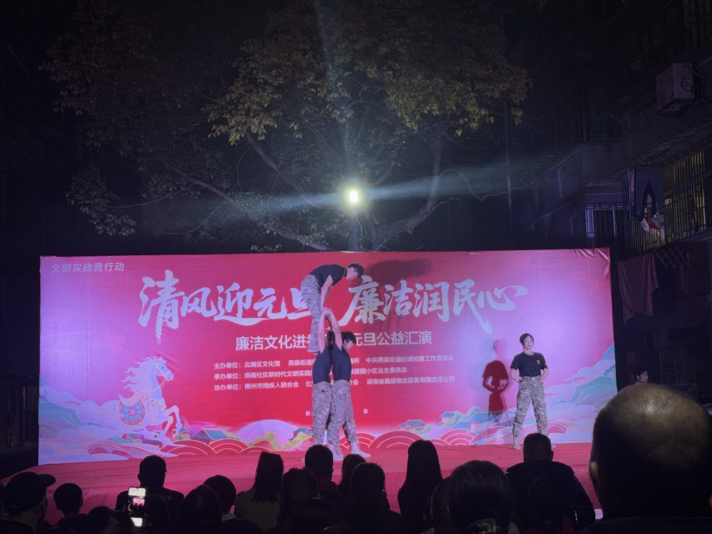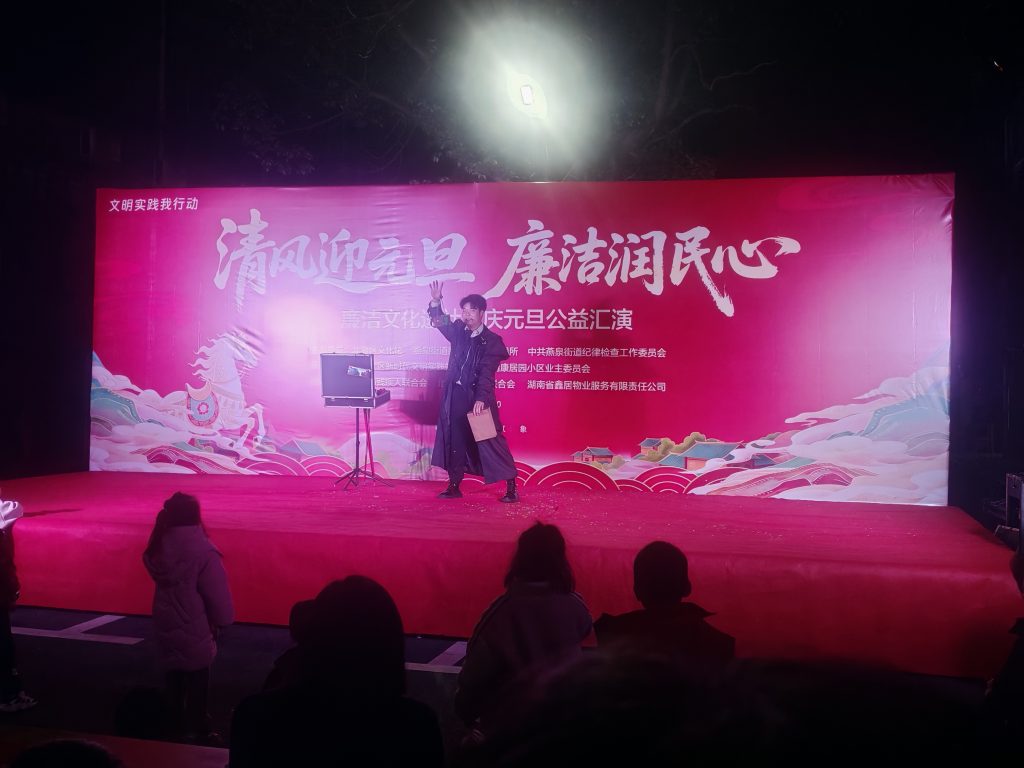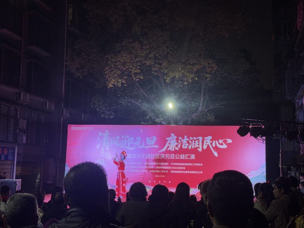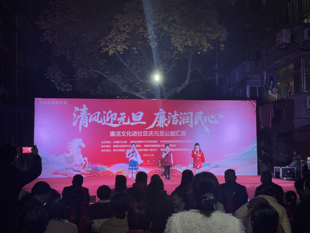 12月30日晚,湘南风情康居园新时代文明实践广场灯火璀璨。由北湖区文化馆联合燕泉街道新时代文明实践所、中共燕泉街道纪律检查工作委员会共同主办的“清风迎元旦 廉洁润民心”廉洁文化进社区公益汇演在此成功举办,为社区居民送上了一场兼具思想性与艺术性的文化盛宴,在辞旧迎新的喜庆氛围中传递崇廉尚洁的正能量。